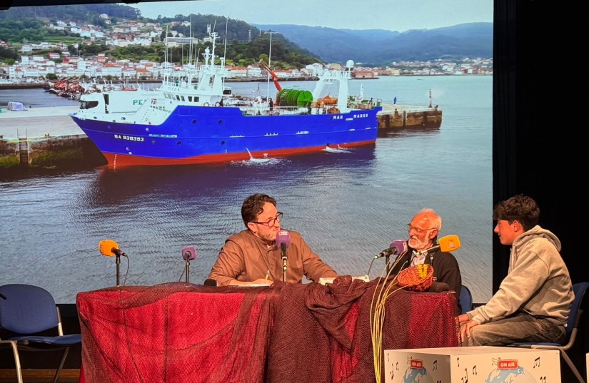 Na segunda das súas paradas esta primavera, o Radiovisual comezou coa animación musical do duo Caamaño & Ameixeiras, que armadas unicamente de violín, acordeón e voz fixeron gozar o público coa súa destreza na reinterpretación da música de raíz. Pasou despois polos micrófonos a alcaldesa de Muros, María Lago Lestón, quen se enfrontou ao desafío das cuestións e a curiosidade do alumnado, que encheu toda unha caixa de preguntas para a que quedou curto o tempo de peneiralas todas. Subiu despois ao escenario Vicente, Chente, “un home que leva o salitre marcado na pel e o horizonte gravado nos ollos”, muradán xubilado logo de cumprir o soño de ser patrón do seu propio barco, quen guiou a rapazada pola súa memoria mariñeira.
